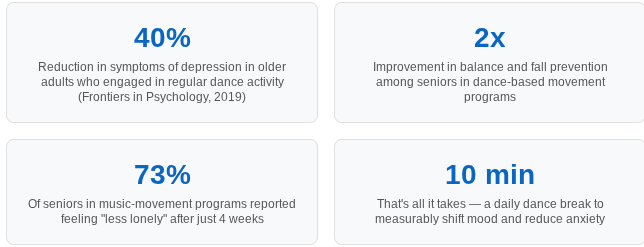The science here is not subtle. Movement and music together create a neurological cascade that antidepressants work hard to replicate. Studies have shown that just 10 minutes of rhythmic movement can significantly lower cortisol (our primary stress hormone), boost serotonin and dopamine, and reduce the perception of pain. For seniors specifically, the benefits go even deeper.